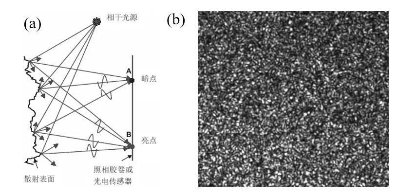 图1(a)激光散斑形成原理示意图; (b) 激光照射时漫射物体表面的图像(散斑图像)