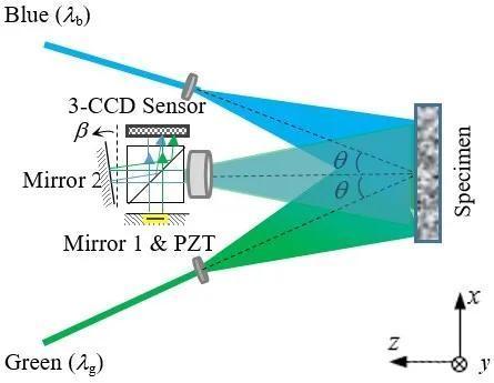 当光线照射到漫射物体表面时,会在物体表面及其附近空间形成随机分布的明暗斑点图案。 20世纪70年代以来,国外学者建立了以散斑作为物体表面变形信息载体的散斑干涉技术,并逐渐发展成为现在普遍使用的电子散斑干涉技术。东南大学杨福军教授课题组提出了一种基于3片式彩色相机的双波长剪切散斑干涉测量方法。有关面外变形的位移导数的信息。