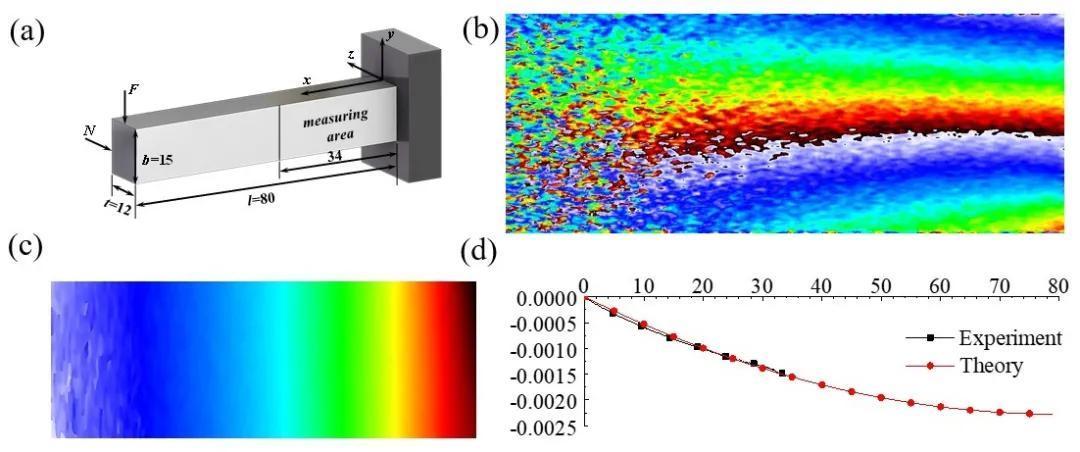图 3 实验设置和结果比较。 (a) 悬臂铝梁示意图; (b) 测量的面内位移导数; (c) 测量的平面外位移导数; (d) dw/dx 实验与理论解的比较
